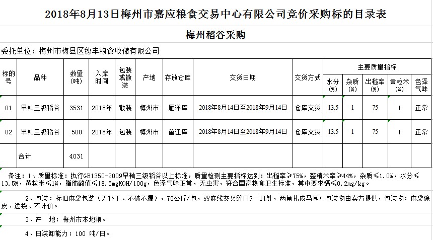 受客戶委托,梅州市嘉應(yīng)糧食交易中心有限公司定于2018年8月13日(星期一)舉辦糧食競(jìng)價(jià)交易會(huì),梅州市梅縣區(qū)穗豐糧食收儲(chǔ)有限公司擬采購(gòu)2018年早秈稻4031噸。