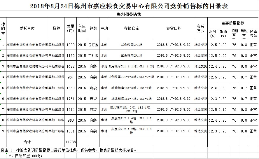 受客戶委托,梅州市嘉應(yīng)糧食交易中心有限公司定于2018年8月24日(星期五)舉辦糧食競價交易會,梅州市金良糧食收儲有限公司擬銷售早秈稻11738噸。