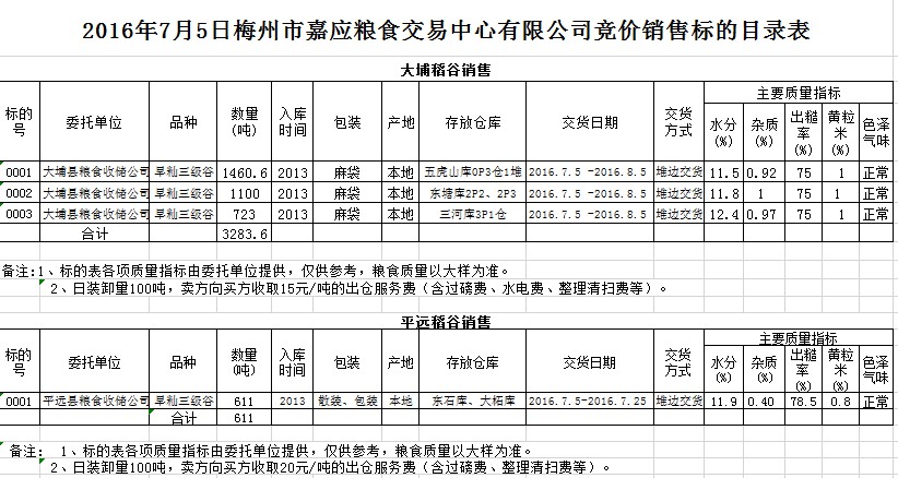 受客戶委托,梅州市嘉應(yīng)糧食交易中心有限公司定于2016年7月5日舉辦糧食競價(jià)交易會(huì),大埔縣糧食收儲(chǔ)公司擬銷售2013年早秈稻谷3283.6噸,平遠(yuǎn)縣糧食收儲(chǔ)公司擬銷售2013年早秈稻谷611噸。