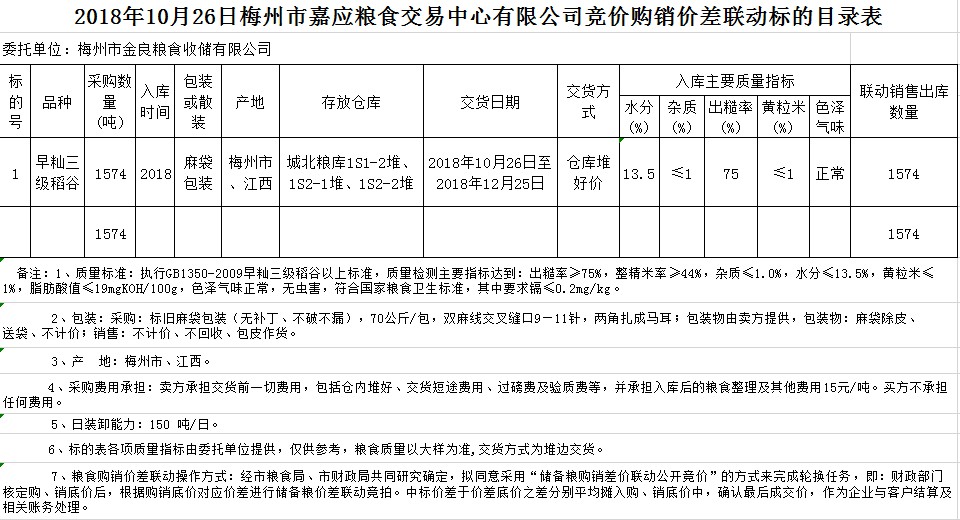 受客戶委托,梅州市嘉應(yīng)糧食交易中心有限公司定于2018年10月26日(星期五)舉辦稻谷購(gòu)銷價(jià)差聯(lián)動(dòng)標(biāo)的交易會(huì),梅州市金良糧食收儲(chǔ)有限公司擬銷售和采購(gòu)早秈稻1574噸。