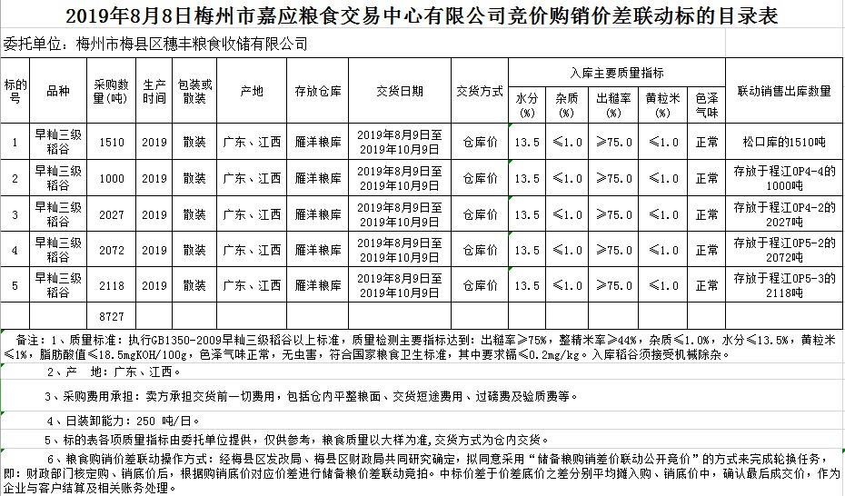 受客戶委托,梅州市嘉應糧食交易中心有限公司定于2019年8月8日(星期四)舉辦稻谷購銷價差聯(lián)動標的交易會,梅州市梅縣區(qū)穗豐糧食收儲有限公司擬銷售和采購早秈稻8727噸。