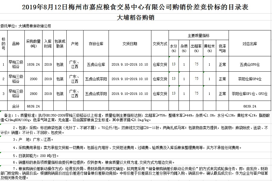 受客戶委托,梅州市嘉應(yīng)糧食交易中心有限公司定于20198月12日(星期一)舉辦稻谷購銷價差聯(lián)動標(biāo)的交易會,大埔縣糧食收儲公司擬銷售和采購早秈稻6639.24噸。