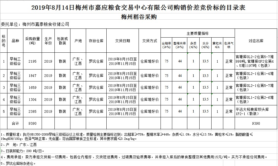受客戶委托,梅州市嘉應(yīng)糧食交易中心有限公司定于2019年8月14日(星期三)舉辦稻谷購銷價差聯(lián)動標的交易會,梅州市嘉泰糧食收儲公司擬銷售和采購早秈稻9390噸。