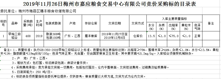 受客戶委托,梅州市嘉應糧食交易中心有限公司定于2019年11月26日(星期二)舉辦糧食競價交易會,梅州市梅縣區(qū)穗豐糧食收儲有限公司擬采購2019年早秈稻468噸。