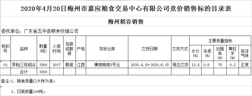 受客戶委托,梅州市嘉應糧食交易中心有限公司定于2020年4月20日(星期一)舉辦糧食競價交易會,廣東省五華縣糧食收儲公司擬銷售2017年早秈稻3300噸。