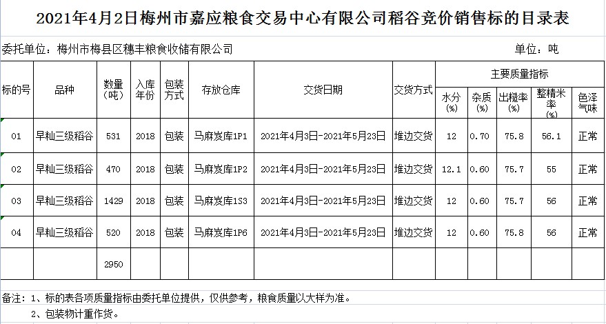 受客戶委托,梅州市嘉應(yīng)糧食交易中心有限公司定于2021年4月2日(星期五)舉辦糧食競(jìng)價(jià)交易會(huì)。梅州市梅縣區(qū)穗豐糧食收儲(chǔ)有限公司擬銷售2018年早秈稻2950噸。