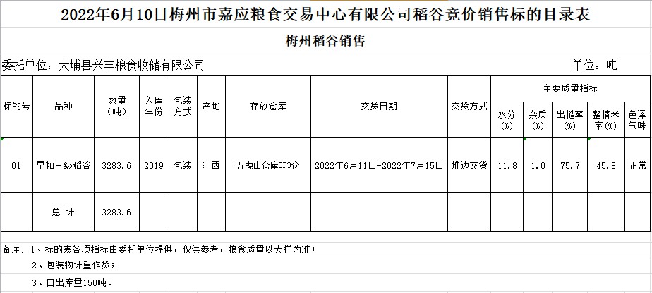 受客戶委托,梅州市嘉應糧食交易中心有限公司定于2022年6月10日(星期五)舉辦糧食競價交易會。大埔縣興豐糧食收儲有限公司擬銷售2019年早秈稻3283.6噸。