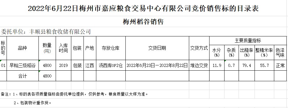 受客戶(hù)委托,梅州市嘉應(yīng)糧食交易中心有限公司定于2022年6月22日(星期三)舉辦糧食競(jìng)價(jià)交易會(huì)。豐順縣糧食收儲(chǔ)有限公司擬銷(xiāo)售2019年早秈稻4800噸。