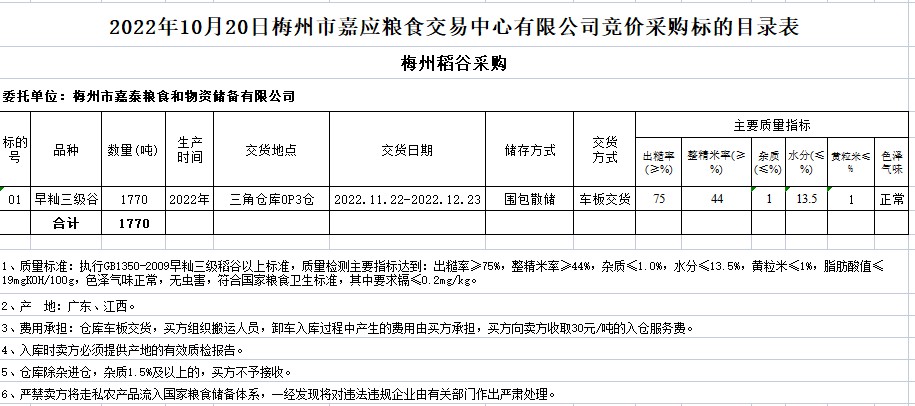 受客戶委托,梅州市嘉應(yīng)糧食交易中心有限公司定于2022年10月20日(星期四)舉辦糧食競(jìng)價(jià)交易會(huì)。梅州市嘉泰糧食和物資儲(chǔ)備有限公司擬采購2022年早秈稻1770噸。
