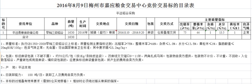 受客戶委托,梅州市嘉應(yīng)糧食交易中心有限公司定于2016年8月9日舉辦糧食競(jìng)價(jià)交易會(huì),平遠(yuǎn)縣糧食收儲(chǔ)公司擬采購(gòu)2016年產(chǎn)早秈三級(jí)稻谷1630噸。