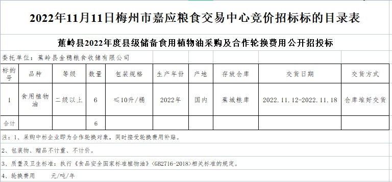 蕉嶺縣2022年度縣級儲備食用植物油采購及合作輪換費用公開招投標公告
