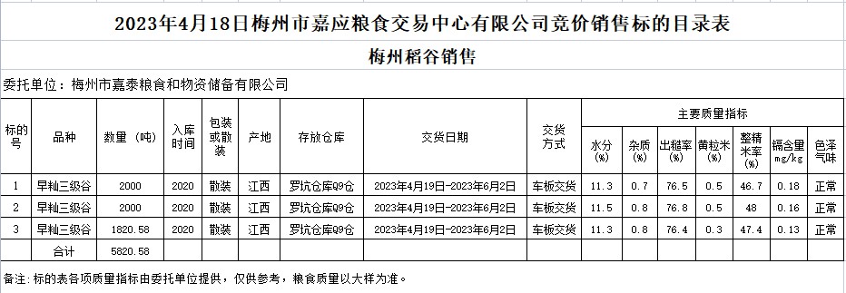 2023年4月18日梅州市嘉泰糧食和物資儲備有限公司稻谷銷售