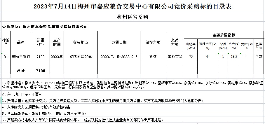 2023年7月14日梅州市嘉泰糧食和物資儲備有限公司稻谷采購
