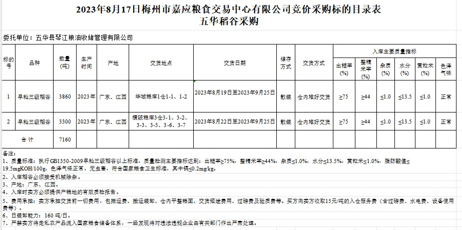 受客戶委托,梅州市嘉應(yīng)糧食交易中心有限公司定于2023年8月17日(星期四)舉辦糧食競(jìng)價(jià)交易會(huì)。五華縣琴江糧油收儲(chǔ)管理有限公司擬采購(gòu)2023年早秈稻7160噸。