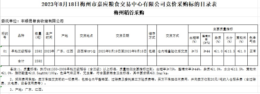 受客戶委托,梅州市嘉應(yīng)糧食交易中心有限公司定于2023年8月18日(星期五)舉辦糧食競價(jià)交易會(huì)。豐順縣糧食收儲(chǔ)有限公司擬采購2023年早秈稻2592噸。