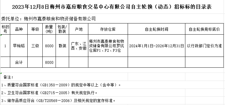 2023年12月8日梅州市2023年度市級儲備糧自主輪換公開招投標公告
