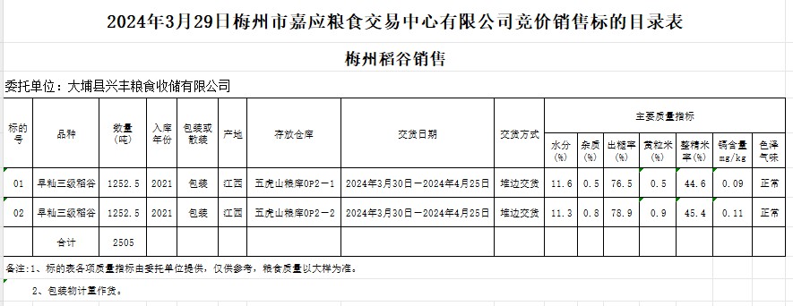受客戶委托,梅州市嘉應(yīng)糧食交易中心有限公司定于2024年3月29日(星期五)舉辦糧食競(jìng)價(jià)交易會(huì)。大埔縣興豐糧食收儲(chǔ)有限公司擬銷售2021年早秈稻2505噸。