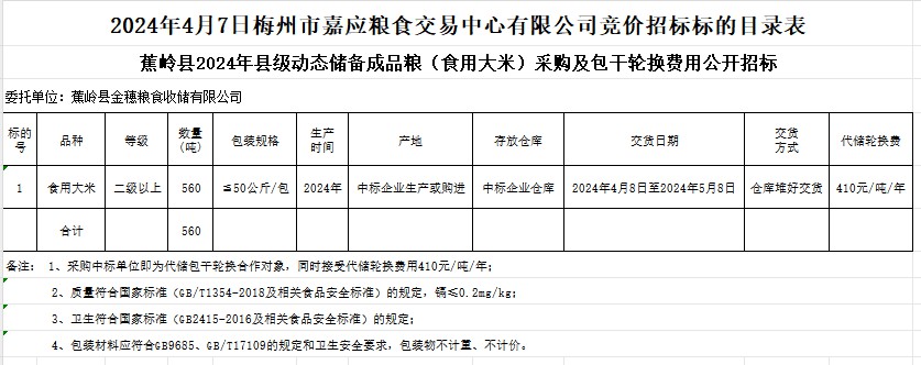 2024年4月7日蕉嶺縣2024年縣級動態(tài)儲備成品糧(食用大米)采購及包干輪換費用公開招標公告