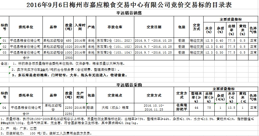 受客戶委托,平遠(yuǎn)縣糧食收儲(chǔ)公司擬銷售2014年早秈三級(jí)稻谷2500噸、采購(gòu)2016年產(chǎn)早秈三級(jí)稻谷2250噸。