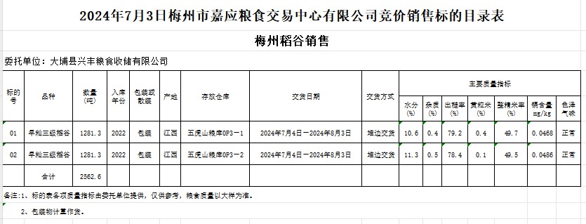 受客戶委托,梅州市嘉應(yīng)糧食交易中心有限公司定于2024年7月3日(星期三)舉辦糧食競價交易會。大埔縣興豐糧食收儲有限公司擬銷售2022年產(chǎn)早秈稻谷2562.6噸。