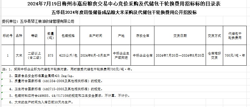 2024年7月19日五華縣2024年度縣級儲備成品糧大米采購及代儲包干輪換費用公開招標公告