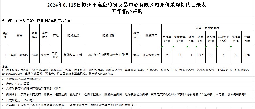 受客戶委托,梅州市嘉應糧食交易中心有限公司定于2024年8月15日(星期四)舉辦糧食競價交易會。五華縣琴江糧油收儲管理有限公司擬采購2024年產早秈稻谷3820噸。