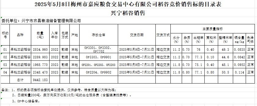受客戶委托,梅州市嘉應糧食交易中心有限公司定于2025年5月8日(星期四)舉辦糧食競價交易會。興寧市齊昌糧油儲備管理有限公司擬銷售2022年、2023年產早秈稻谷9442.183噸。