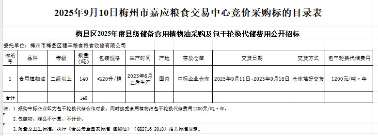 梅縣區(qū)2025年度縣級儲備食用植物油采購及包干輪換代儲費(fèi)用公開招標(biāo)公告