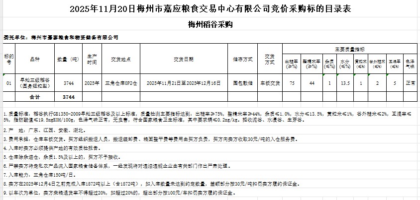 受客戶委托,梅州市嘉應(yīng)糧食交易中心有限公司定于2025年11月20日(星期四)舉辦糧食競(jìng)價(jià)交易會(huì)。梅州市嘉泰糧食和物資儲(chǔ)備有限公司擬采購(gòu)2025年產(chǎn)早秈稻谷3744噸。