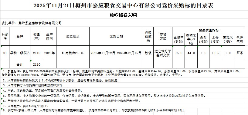 受客戶委托,梅州市嘉應(yīng)糧食交易中心有限公司定于2025年11月21日(星期五)舉辦糧食競價(jià)交易會(huì)。蕉嶺縣金穗糧食收儲(chǔ)有限公司采購2025年產(chǎn)早秈稻谷2110噸。