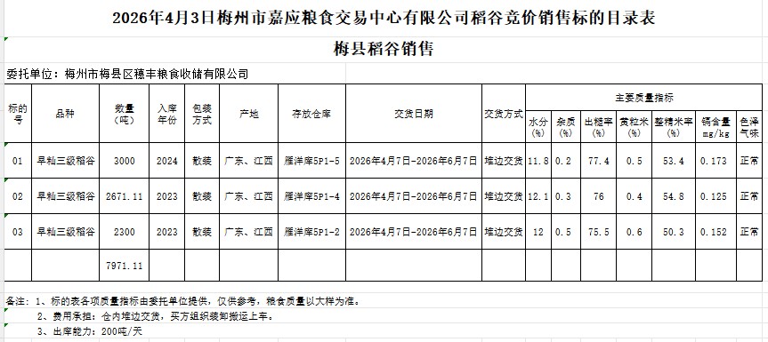 受客戶委托,梅州市嘉應(yīng)糧食交易中心有限公司定于2026年4月3日(星期五)舉辦糧食競(jìng)價(jià)交易會(huì)。梅州市梅縣區(qū)穗豐糧食收儲(chǔ)有限公司擬銷(xiāo)售2023年產(chǎn)早秈稻谷7971.11噸。