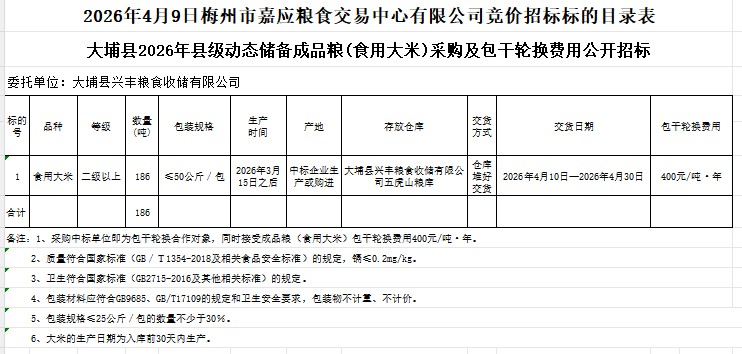 大埔縣2026年縣級動態(tài)儲備成品糧(食用大米)采購及包干輪換費用公開招標(biāo)公告