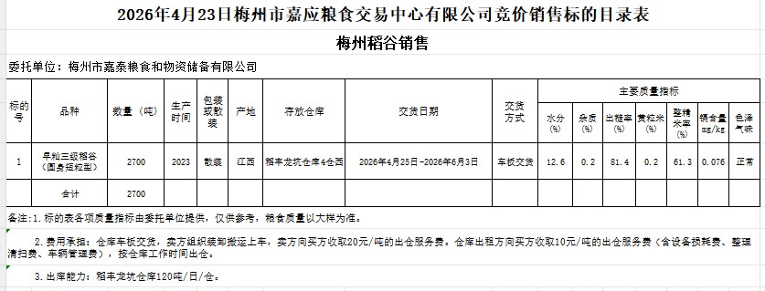 受客戶委托,梅州市嘉應(yīng)糧食交易中心有限公司定于2026年4月23日(星期四)舉辦糧食競價交易會。梅州市嘉泰糧食和物資儲備有限公司擬銷售2023年產(chǎn)早秈稻谷(圓身短粒型)2700噸。