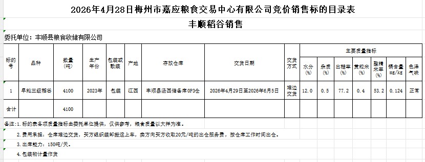 受客戶委托,梅州市嘉應(yīng)糧食交易中心有限公司定于2026年4月28日(星期二)舉辦糧食競價交易會。豐順縣糧食收儲有限公司擬銷售2023年產(chǎn)早秈稻谷4100噸。