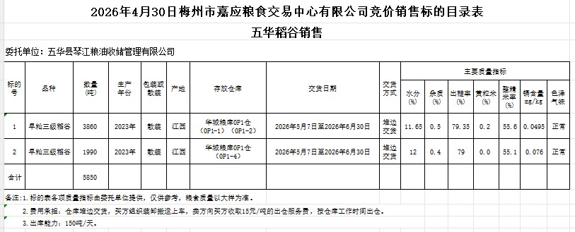 受客戶委托,梅州市嘉應(yīng)糧食交易中心有限公司定于2026年4月30日(星期四)舉辦糧食競(jìng)價(jià)交易會(huì)。五華縣琴江糧油收儲(chǔ)管理有限公司擬銷售2023年產(chǎn)早秈稻谷5850噸。