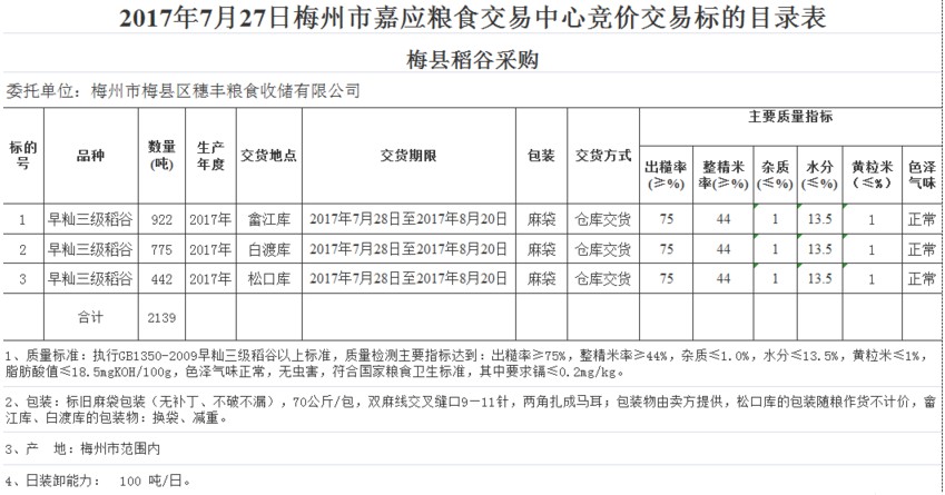 受客戶委托,梅州市嘉應(yīng)糧食交易中心有限公司定于2017年7月27日舉辦糧食競價交易會,梅州市梅縣區(qū)穗豐糧食收儲有限公司擬采購2017年早秈三級稻谷共2139噸。