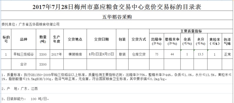 受客戶委托,梅州市嘉應(yīng)糧食交易中心有限公司定于2017年7月28日舉辦糧食競價交易會,廣東省五華縣糧食收儲公司擬采購2017年早秈三級稻谷共3300噸。