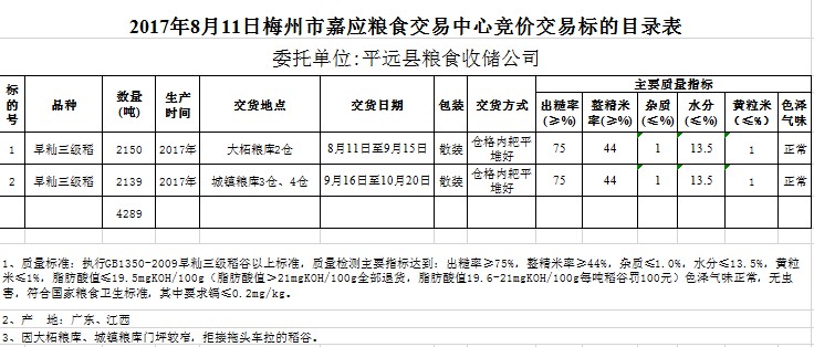 受客戶委托,梅州市嘉應(yīng)糧食交易中心有限公司定于2017年8月11日舉辦糧食競價(jià)交易會(huì),平遠(yuǎn)縣糧食收儲(chǔ)公司擬采購2017年早秈三級(jí)稻谷共4289噸。