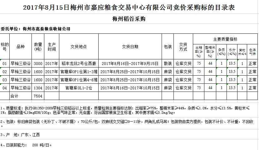 受客戶委托,梅州市嘉應(yīng)糧食交易中心有限公司定于2017年8月15日舉辦糧食競(jìng)價(jià)交易會(huì),梅州市嘉泰糧食收儲(chǔ)公司擬采購2017年早秈三級(jí)稻谷共7504噸。