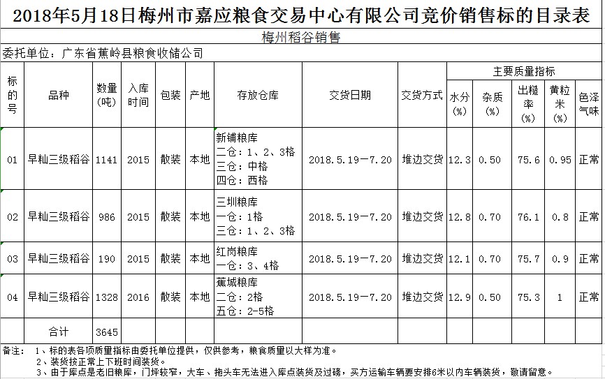 交易時間和地點:2018年5月18日(星期五)上午10時。廣東省梅州市彬芳大道南161號梅州市糧食交易中心3樓。