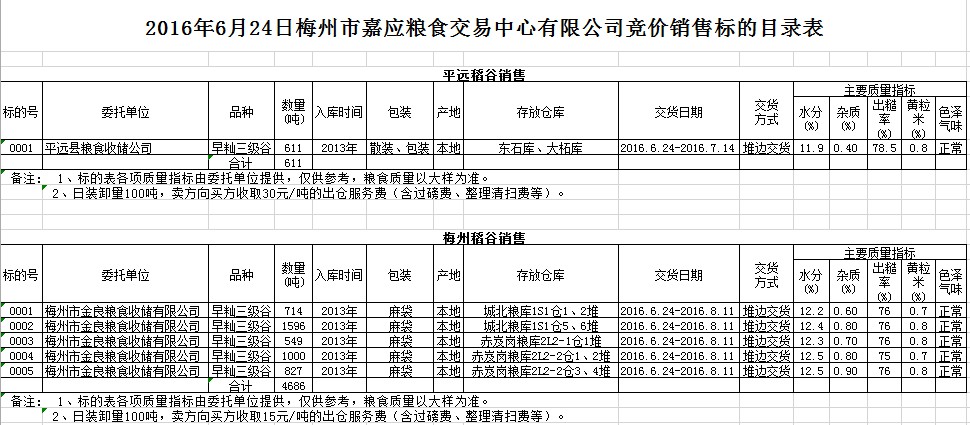 受客戶委托,梅州市嘉應糧食交易中心有限公司定于2016年6月24日舉辦糧食競價交易會,平遠縣糧食收儲公司擬銷售2013年早秈稻谷611噸,梅州市金良糧食收儲有限公司擬銷售2013年早秈稻谷4686噸。