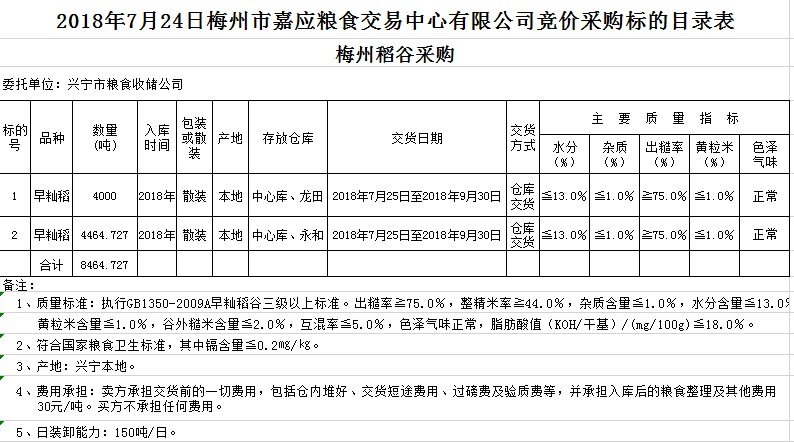 交易時(shí)間和地點(diǎn):2018年7月24日(星期二)上午10時(shí)。廣東省梅州市彬芳大道南161號梅州市糧食交易中心3樓。