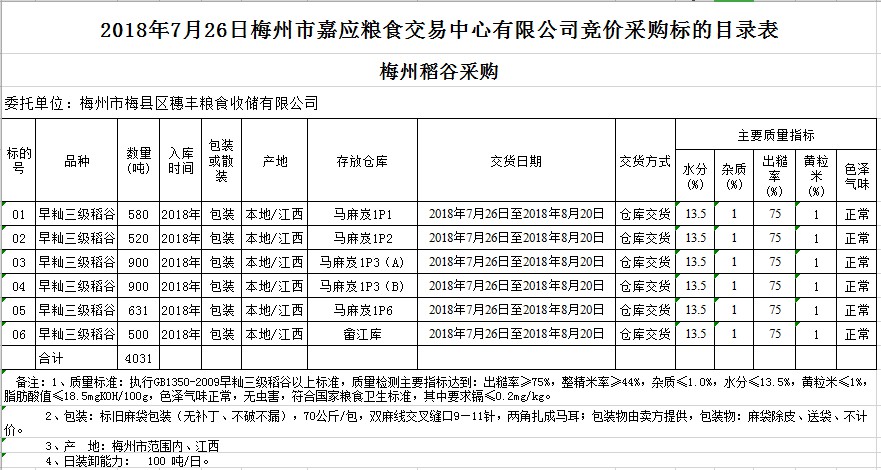 交易時(shí)間和地點(diǎn):2018年7月26日(星期四)上午10時(shí)。廣東省梅州市彬芳大道南161號梅州市糧食交易中心3樓。