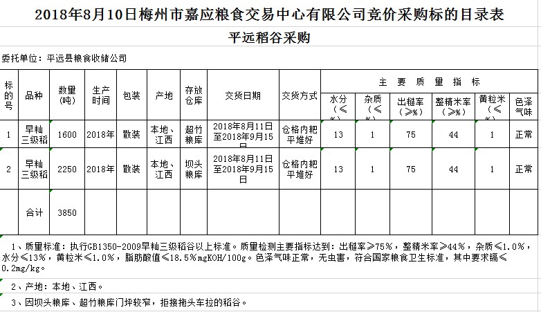 交易時(shí)間和地點(diǎn):2018年8月10日(星期五)上午10時(shí)。廣東省梅州市彬芳大道南161號(hào)梅州市糧食交易中心3樓。